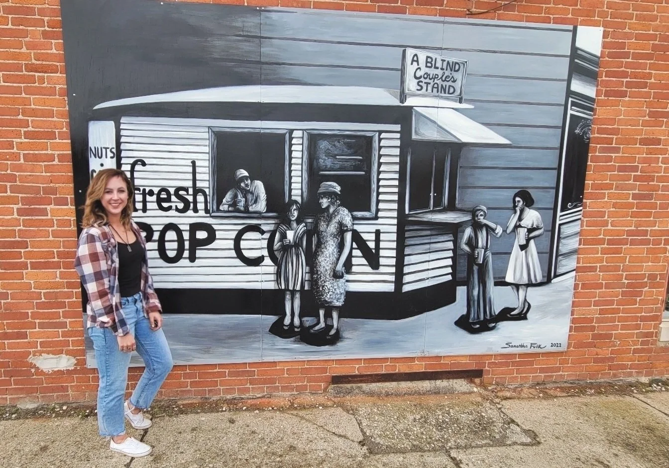 Commissioned by and located on the History Center in Churubusco, this mural memorializes the famous 'Blind Couple's Popcorn Stand' on Main Street owned by Clarence and Fern Brumbaugh in the 1930's. The couple both went blind during childhood and relied on the generosity of the community to thrive. The stand was a popular hang-out for kids and adults alike, who often stopped on their way through town.
