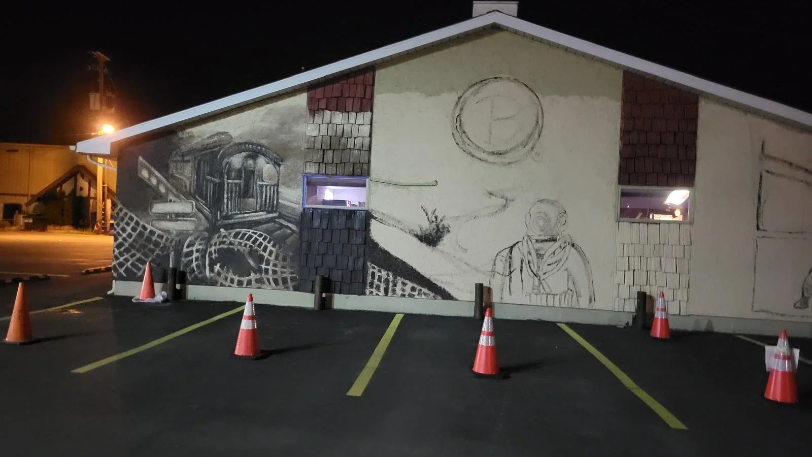 Displaying a timeline of Churubusco history, the composition starts with the train tracks that ran over Main Street from the mid 1800's that united two towns and ultimately created Churubusco. The diver and broken net represent the famous hunt for Oscar the turtle, an event that made national headlines. In the early 1900’s, a monstruous turtle was “discovered” in Fulk Lake and was subsequently dubbed the "Beast of Busco", attracting thousands of spectators from all over the country to watch the hunt. For the last section of the mural, I wanted to capture the feeling of modern Busco, a fiercely competitive and prideful town. I painted a break-up of different high school sports to show how the community always comes together for their own.