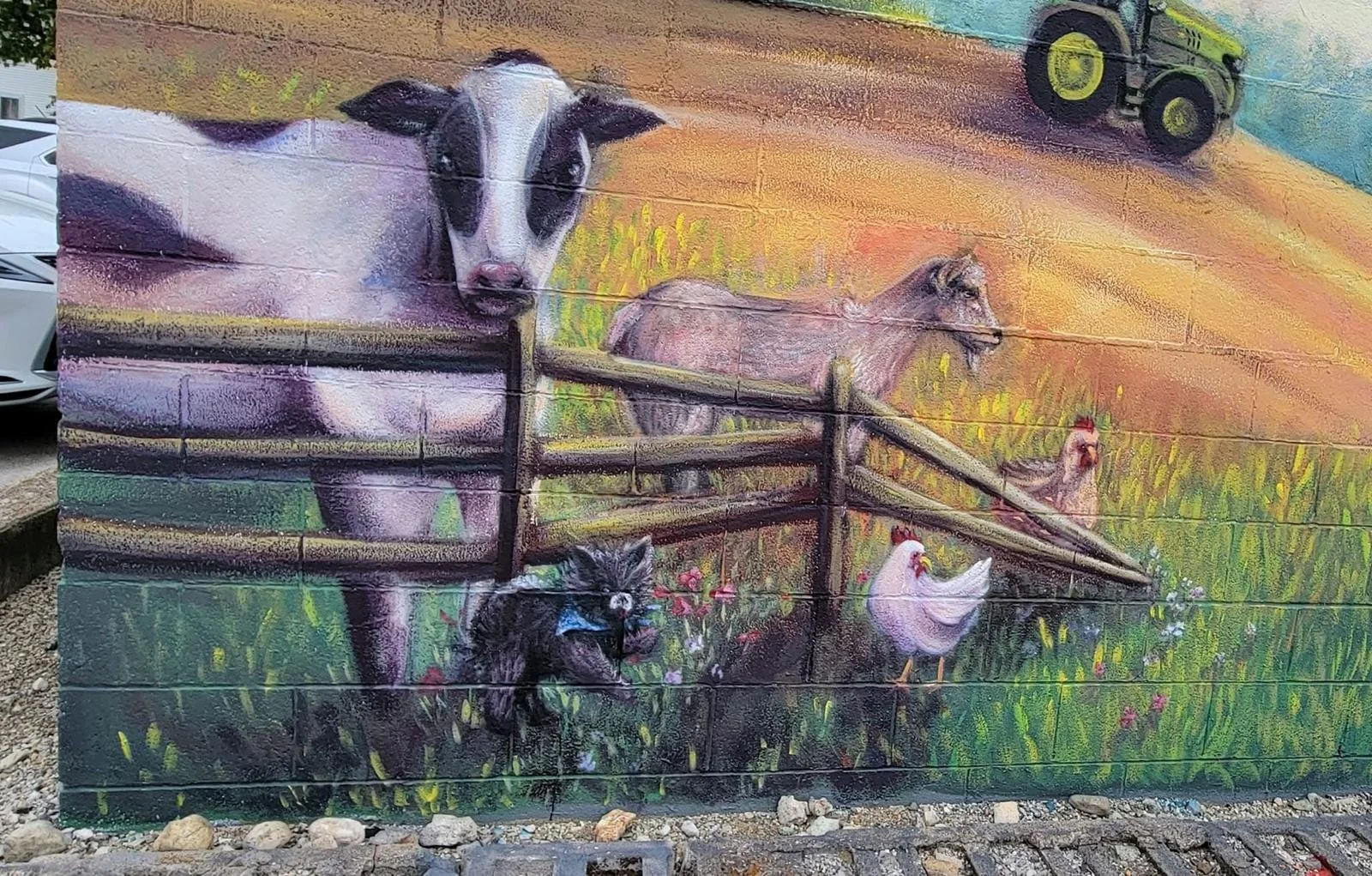 Commissioned by Vintage Blessed General Store in Columbia City, this mural was very personal to owners Michelle and Ken. Its main function is to be an eye-catching way to welcome drivers to the city but could also be an interactive experience for photos, allowing someone to pose along the road. The eagle represents the local high school’s mascot, while the left composition shows the beautiful farmlands the city is surrounded by. The buildings depict mainly notable locations such as the courthouse, hospital, post office and the sunflowers and dog were a personal homage to the owners.