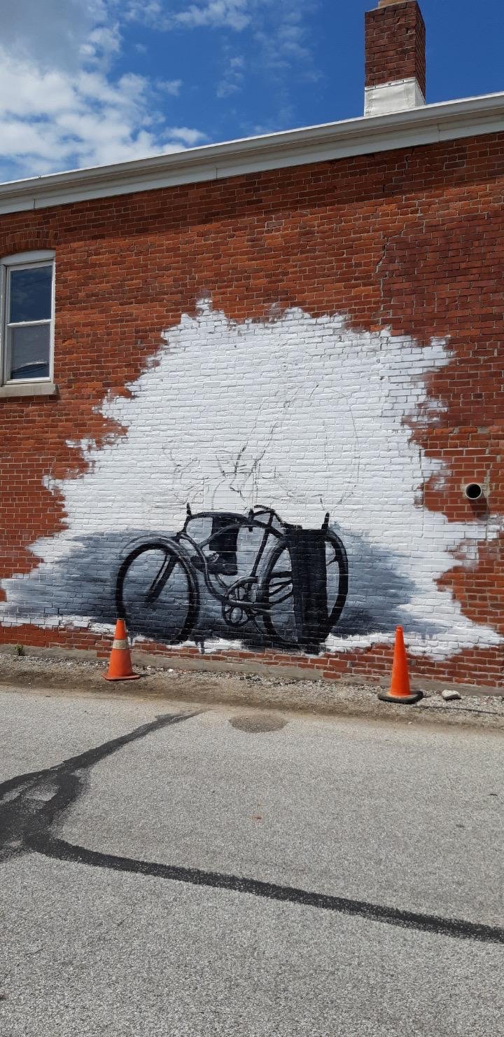 This mural acts as a memorial for Churubusco's beloved John Krieger. John was born in Busco in the 1930's and had Down's syndrome. At this time, those with this condition were usually sent to institutions or kept indoors. However, his parents refused to do this, and the town supported John in all his endeavors. They watched him grow up and as he started thriving into adulthood, people began "employing" him in several businesses so that he always had something to do. He often helped out at and checked in on local insurance agents, medics, store owners, etc. He visited the police station so often that they gave him his own badge, and he'd ride around on his bicycle making sure there was no trouble in the community. He lived to be 68, passing away in 2003.