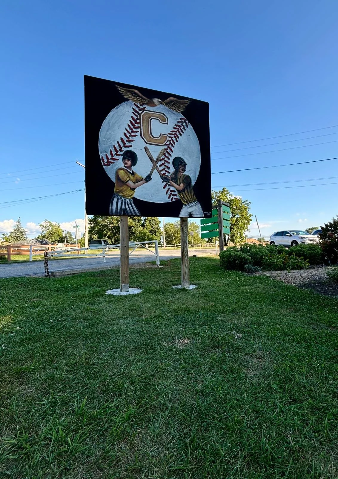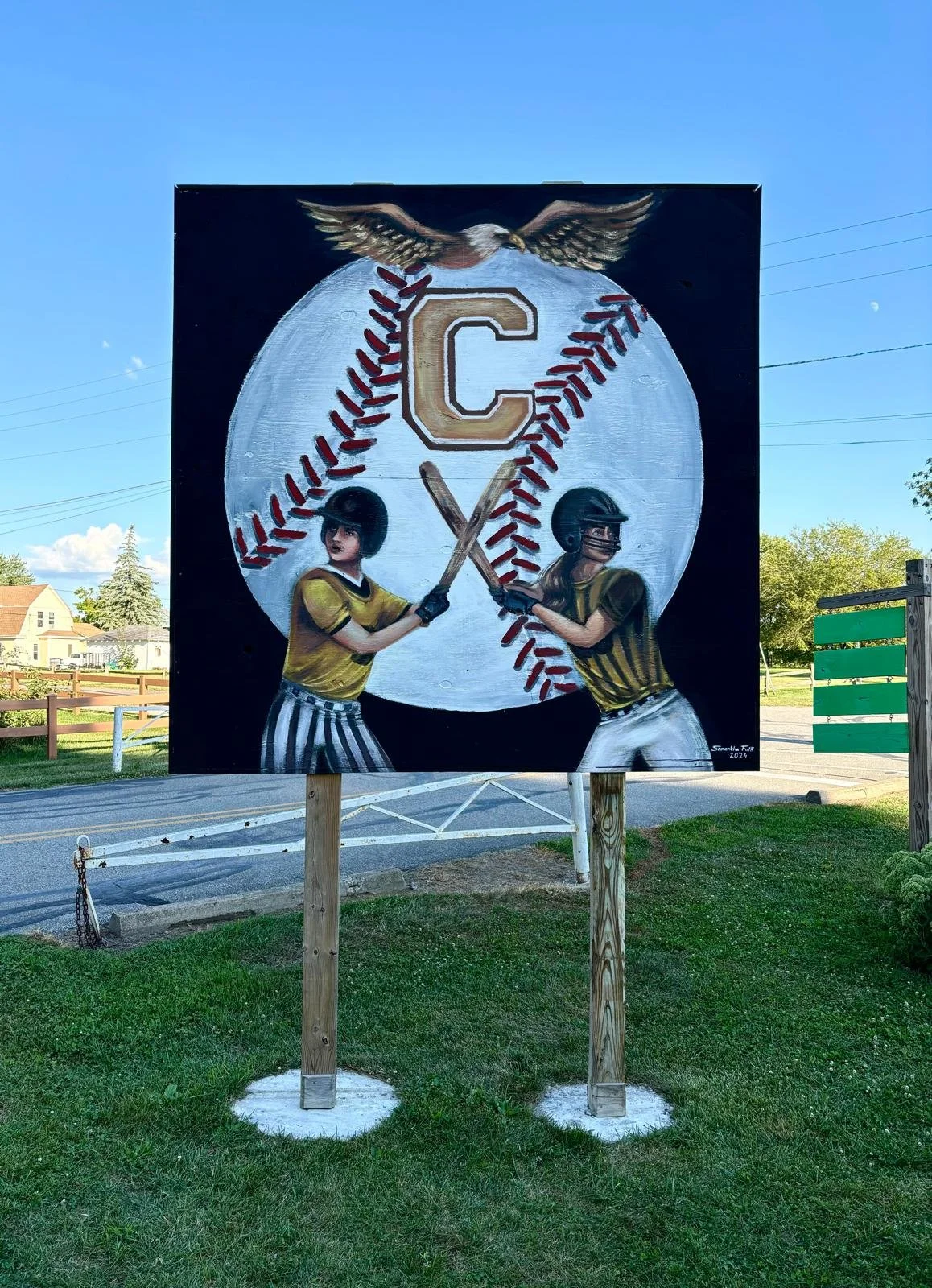 Commissioned by Rick Krider for the Churubusco Park, this mural of a Busco player defending home plate sits on the concession stand of softball diamond 1 to welcome players
