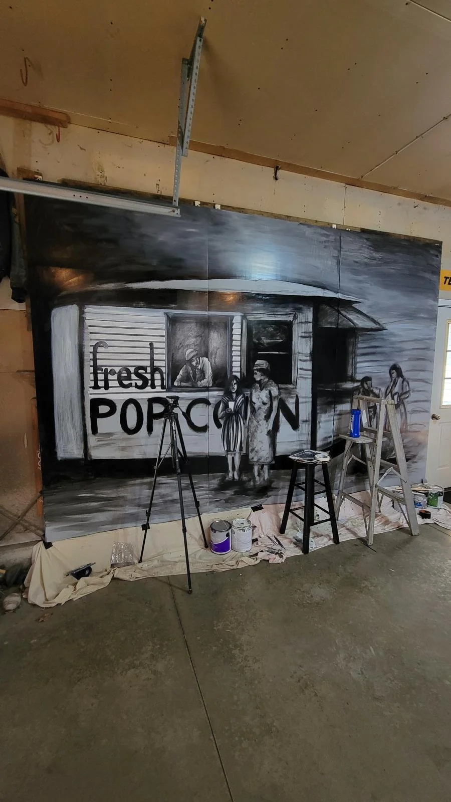 Located in the Dell Cove Spices & More warehouse in New Haven, this piece was commissioned by founders Patricia and David to capture the many uses for their popcorn seasonings. Therefore, it displays a panoramic composition of the local Tincaps Stadium, a movie theatre, and a family having a movie night on the couch along with Dell Cove products scattered throughout.